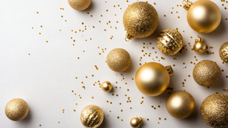 A beautiful arrangement of gold Christmas ornaments with various textures and sizes scattered over a soft white background, perfect for holiday cheer and decor.
