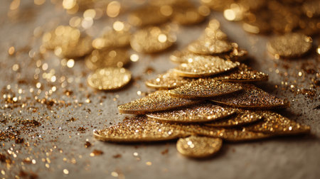 Sparkling golden Christmas tree decoration with shiny confetti on a festive surface