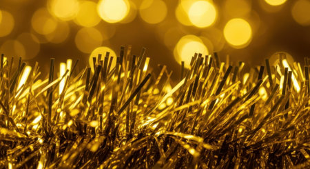 Close-up of golden tinsel garland with blurred bokeh lights in the background, creating a festive and celebratory atmosphere.