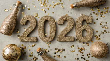 Golden numbers spelling out 2026 surrounded by glitter, champagne bottles, and festive confetti, perfect for New Years Eve.