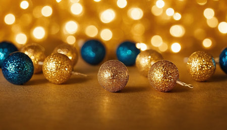 Christmas decoration on a gold background with bokeh lights and copy space.
