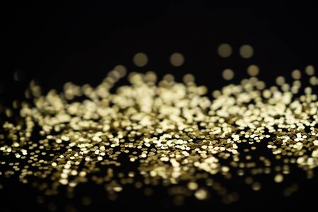 Golden sparkles on a black background. Festive abstract background.