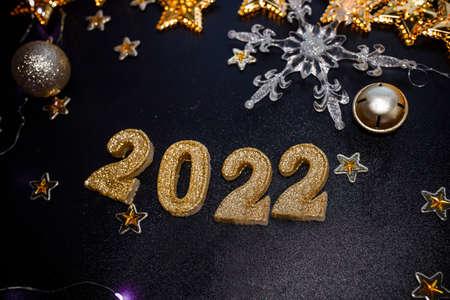 Happy New Year 2022. Holiday background with golden Christmas decorations. 2022 numbers with gold jewelry balls and garland in form of stars.
