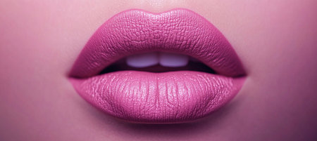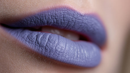 This striking close-up image showcases a model's lips adorned with a vibrant purple matte lipstick, emphasizing the rich color and detailed texture perfect for beauty promotion.