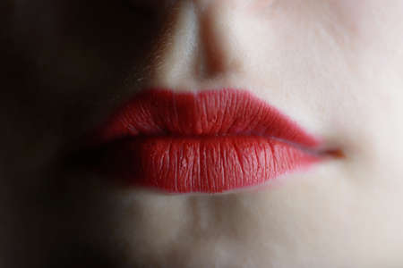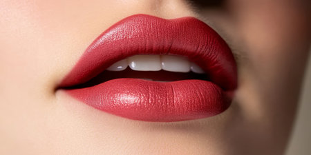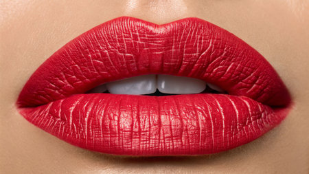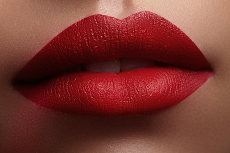 Red lipstick on female lips closeup, smooth skin texture, sensual makeup look, glamorous cosmetic portrait