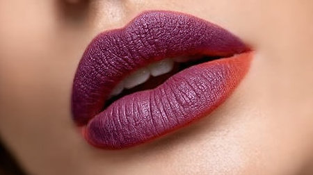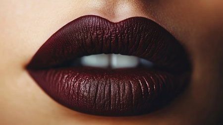 Close-up of a woman's lips with a bold, dark plum lipstick, emphasizing the intensity. -