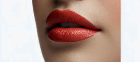 A close-up of a woman lips with a bold, red lipstick, emphasizing the color and gloss, against a clean white background for a striking beauty shot.