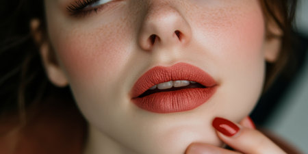 Closeup of Beautiful Woman s Sensual Crimson Lips with Stunning Lipstick for Makeup Creatives