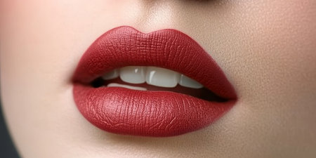 Close Up Artistic Shot of Plump Female Lips with Luscious Crimson Lipstick and Dental Aesthetics