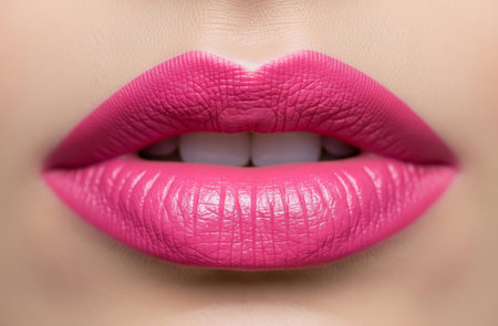Woman's glossy pink lips slightly open, revealing white teeth, perfect for beauty and cosmetics advertisements