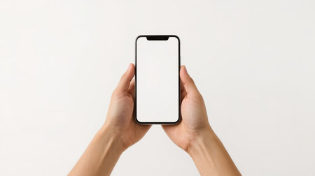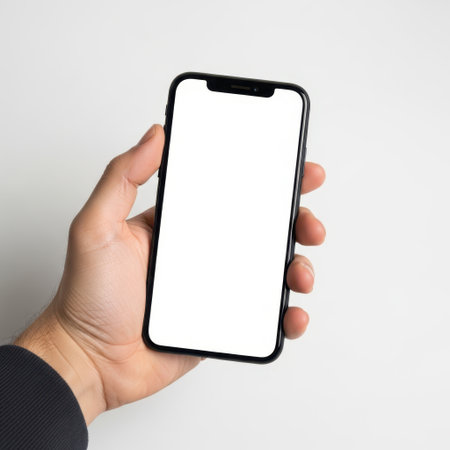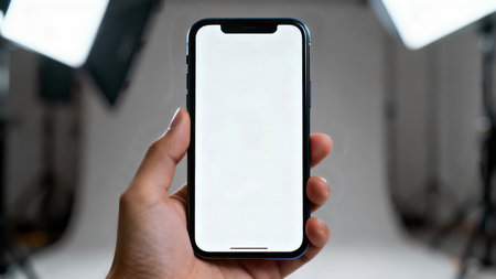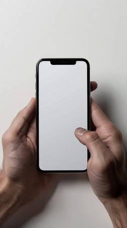 A hand displays a modern black smartphone featuring a frameless design and blank screen. The device is isolated on a clean white background, perfect for showcasing mobile designs. Generated AI