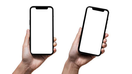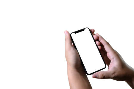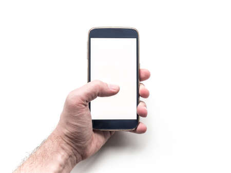 Man hand using smartphone with blank screen, isolated on white background