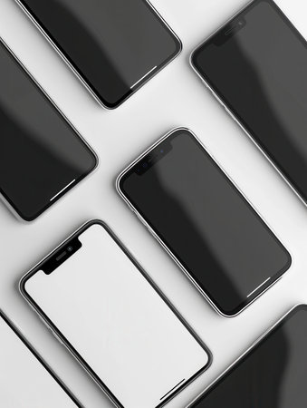 Several modern smartphones arranged in different angles on a white surface, perfect for mobile technology and smartphone accessory companies.