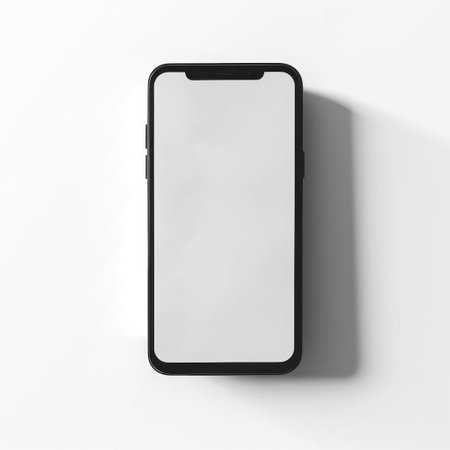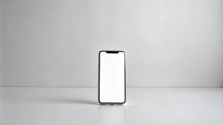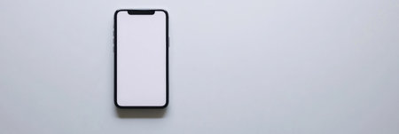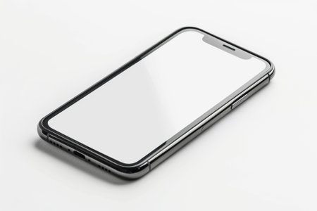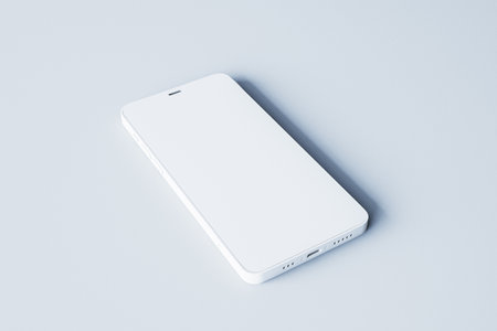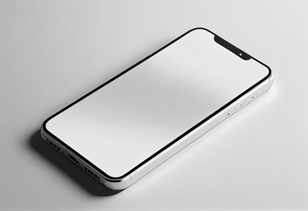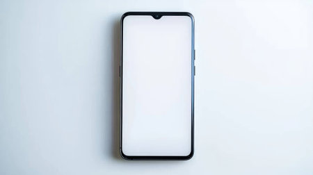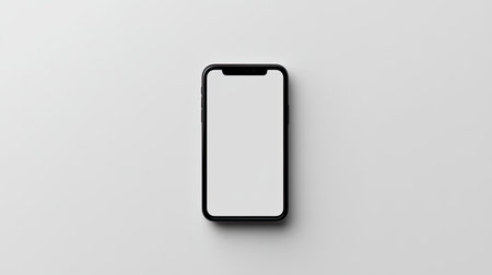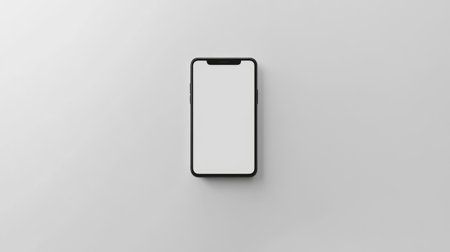 A blank smartphone sits on a white surface, ideal for mockup designs and digital presentations, offering a clean and modern aesthetic for creative projects.