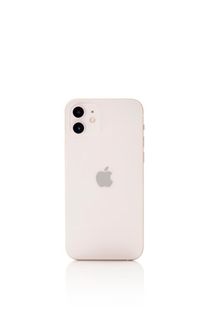 Bratislava, Slovakia - December 07, 2020. iPhone 12 White isolated on white background with reflection. Product photo studio shot.