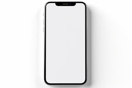 A high-resolution front-facing image of a contemporary smartphone. Its pristine blank white screen offers the perfect canvas for showcasing your digital creations app designs and website mockups.