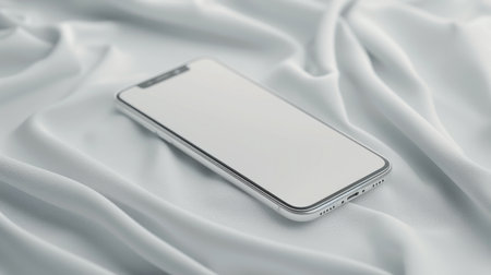 A sleek mobile phone lies flat on a smooth, white fabric surface, showing its elegant design and reflective screen while creating a serene and minimalist atmosphere.