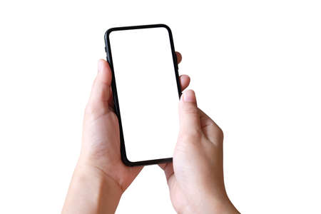 Female hands holding smartphone with blank screen on white background, mockup