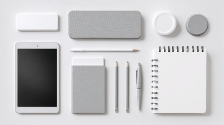 Tablet and notepad arranged for business flat lay on white background