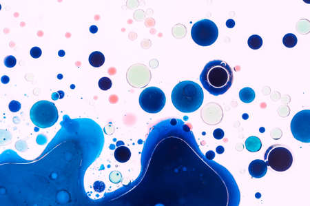 Ink bubble particles. Paint water. Defocused blue white purple color glitter oil round liquid floating on abstract bokeh background.