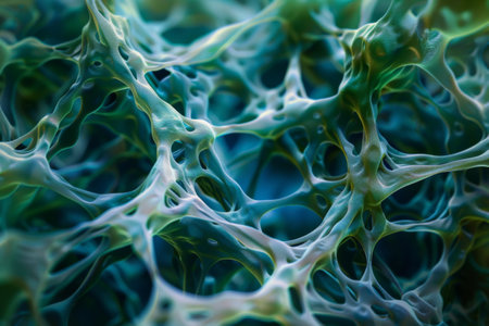 A close-up of an abstract organic structure with neon blue and purple hues, resembling a microscopic world filled with geometric patterns and fractal-like structures. The scene is captured in high resolution, showcasing the intricate details that create depth and dimensionality within each cell or woven grid. This visual representation captures both the beauty of science fiction and the complexity found in natural microcosms. --ar 3:2 --v 6.1 Job ID: 7b7fce0c-4e66-4cdb-b423-3461f2f9e188