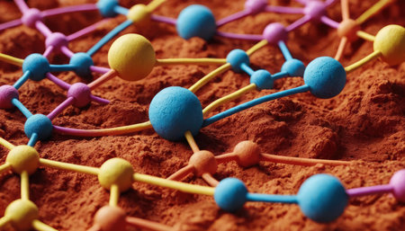 Molecular structure on cocoa powder background, closeup. Genetic engineering