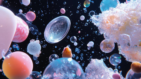 An enchanting abstract image showcasing colorful bubbles and spheres floating against a dark background, reflecting light and creating a dreamy atmosphere.