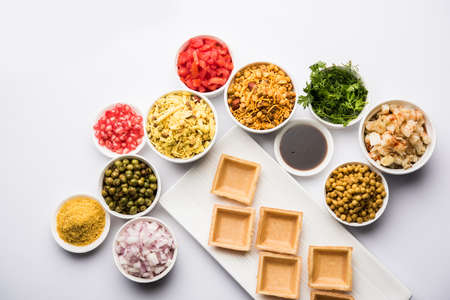 empty Crispy Canape or canapé is a starter recipe from India - Round or square shaped Puri to be Filled with Yogurt and potato , chat, sev, tamarind sauce etc. selective focus
