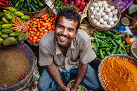 A cheerful vegetable vendor smiles warmly at a local market, surrounded by fresh produce and fellow vendors.