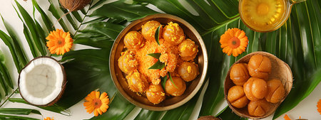 Assorted Indian food set with flowers and palm leaves. Dishes of Indian dishes for puja ceremony