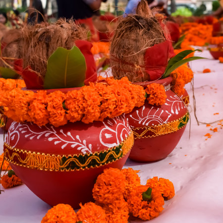 Kalash with coconut and mango leaf with floral decoration earthen pots containing sacred water. Kalash for hindu puja during Jagannath Temple Mangal Kalash Yatra, front view, closeup