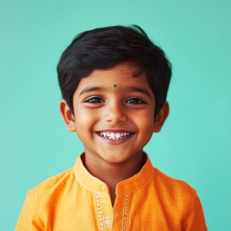 A smiling Hindu boy, 8-10 years old, in a joyful portrait against a pastel plain background, perfect for commercial photography and advertising campaigns