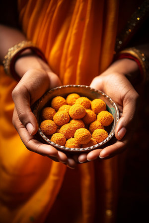 Diwali or festive of lights. Traditional Indian diwali festival, woman hands holding oil lamp