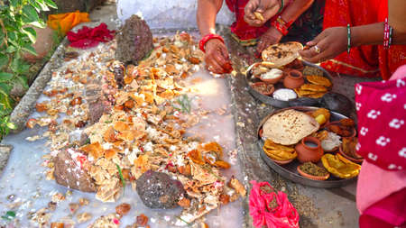 Human hand offering prayer in a Hindu Goddess temple. Religious female offering pray for God on Ramnavmi.