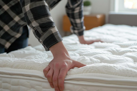 Closeup of man's hand touching soft orthopedic mattress on bed at home
