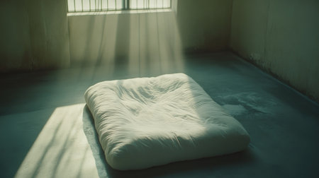 A serene bedroom scene featuring a soft mattress adorned with a decorative pillow, bathed in warm natural light, perfect for promoting relaxation and comfort.
