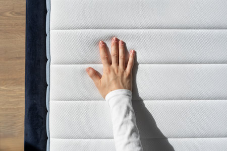 Flat lay of woman hand pressing on white orthopedic mattress with memory foam. Female checking hardness and softness. Choice of the best type and quality