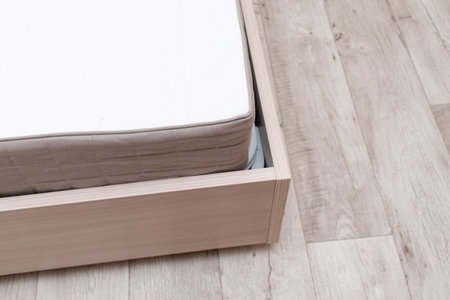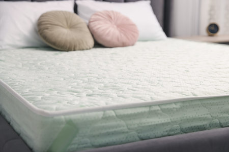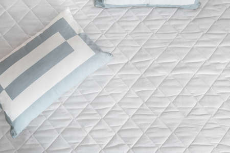 Close-up of mattress in a modern bedroom. blue toned