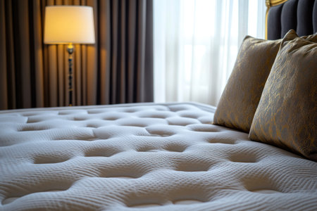 A high-quality, professional photograph of an elegant mattress centered in the frame, with a white sheet and pillows with golden accents, standing against the wall near a floor lamp. The background features light curtains, creating a bright atmosphere. A luxurious bed frame adds to its appearance. High resolution, shot using a Canon EOS R5 camera. --ar 3:2 --v 6.1 Job ID: 9515210e-670a-4ac6-abfa-d6f0af55a4b8