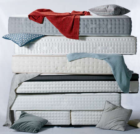 Showroom Interior with Multiple Displayed Mattresses and Decorative Pillows in Natural Light. High quality photo