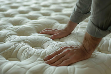 Cropped shot of man testing the firmness of white orthopedic mattress. Male pressing hypoallergenic foam mattresses surface to check its softness. Close up, copy space, top view, background.