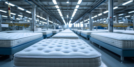 Efficient Production of Comfortable Mattresses in a Modern Factory Using Automated Machinery. Concept Automated Machinery, Mattress Production, Factory Efficiency, Modern Technologies