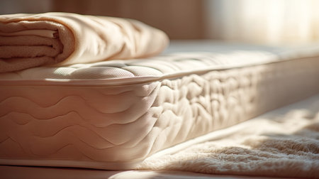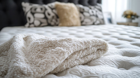 A soft mattress paired with a neatly folded blanket creates a cozy bedroom atmosphere perfect for relaxation and restful sleep. Ideal for home decor.