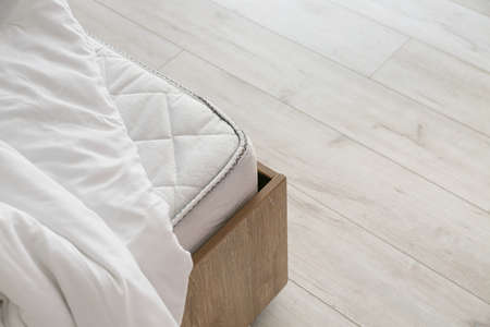 Close-up of a soft mattress on a wooden floor in a dark room