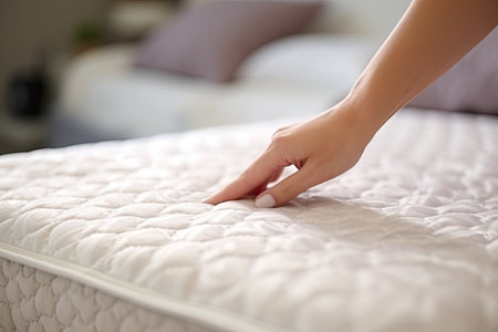 Close-up of a hand pressing on a white quilted mattress in a well-lit, cozy bedroom setting