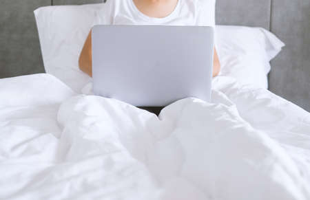 A woman using a laptop to work on the bed, work from home concept.