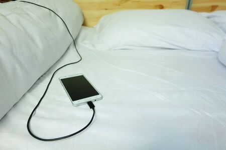 Smart phone is charging is plugged on the white bed, The danger of charging electricity when sleeping.