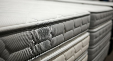 Closeup of new modern orthopaedic mattress on display for sale in large furniture store