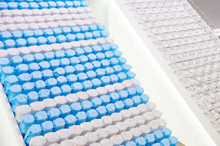 Pocket independent spring sewn in white span-bond in store. Sample of spring mattress filler in store