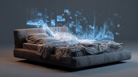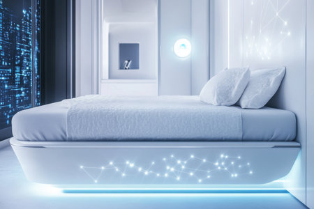 A sleek, white bed with glowing accents dominates a minimalist room adorned with digital patterns.